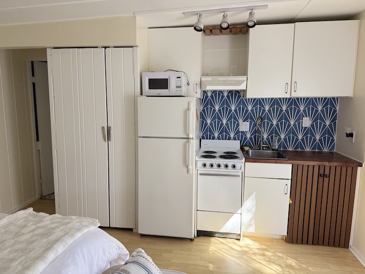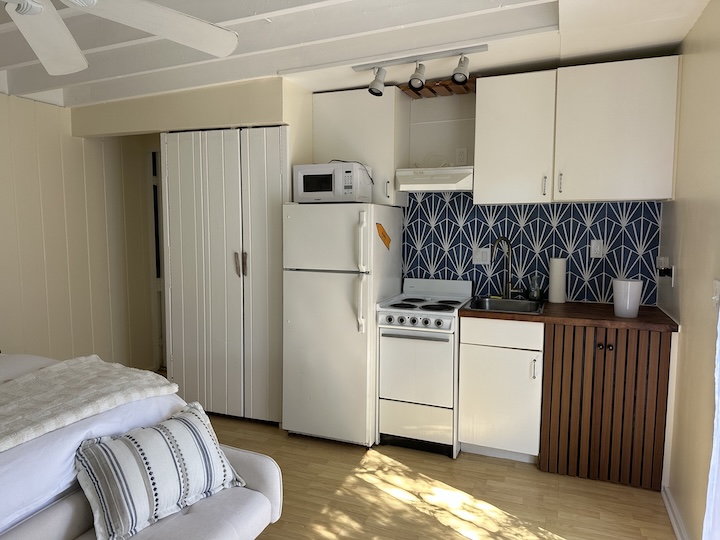 Full Description: Spacious Studio with large private deck. Newly renovated, fully equipped with A/C, SmartTV, and super high-speed wifi. Well-appointed kitchen with full-size fridge, microwave and ample counter space for meal preparation. Luxury queen bed with deluxe bedding, sheets for a restful night's sleep. Plenty of closet space is provided to accommodate all your belongings. New bathroom with XL deluxe shower.